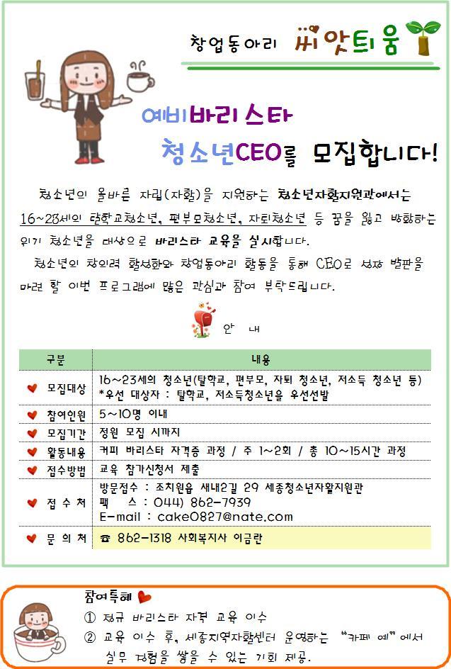 씨앗틔움 동아리회원 모집 페이지 정보 작성자 관리자 댓글 0건 조회 10,794회 작성일 13-12-18 08:52 목록 본문 이전글청소년드림스케치 "전문직업인 만남" 13.12.27 다음글세종지역자활센터 노인일자리사업 아파트택배 참여자 모집 13.12.12 댓글 0 댓글목록 등록된 댓글이 없습니다.