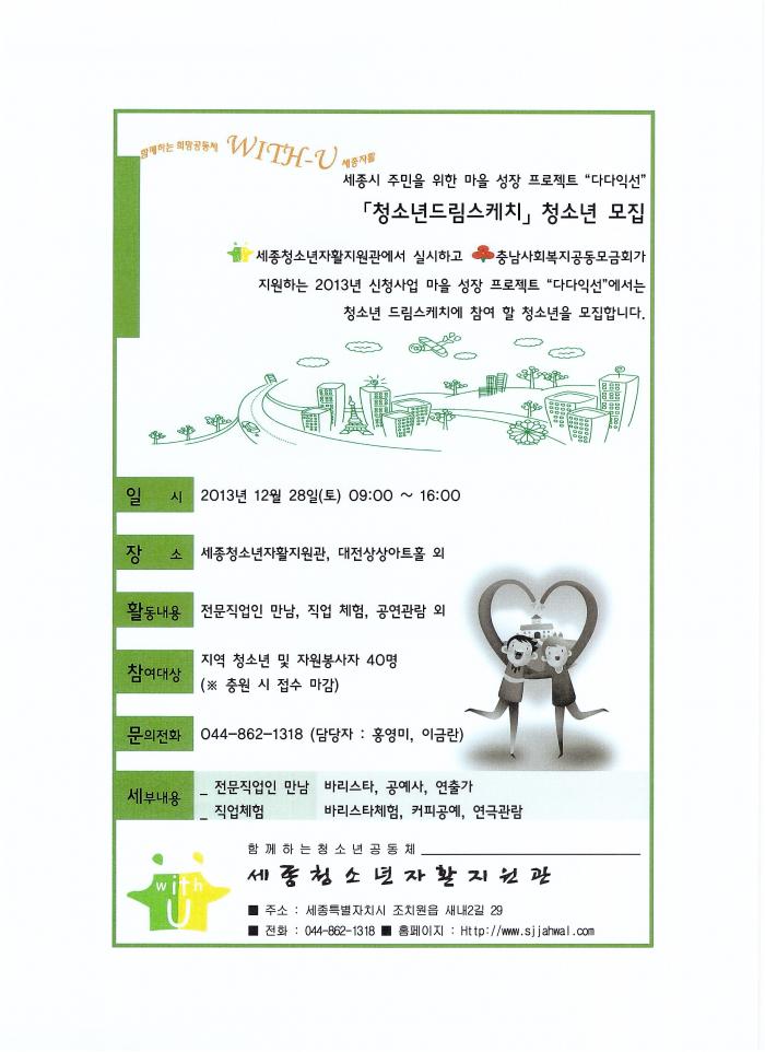 청소년드림스케치 "전문직업인 만남" 페이지 정보 작성자 관리자 댓글 0건 조회 10,961회 작성일 13-12-27 05:08 목록 본문 이전글2014 가온 청소년방과후아카데미 참가 청소년 모집 14.01.20 다음글씨앗틔움 동아리회원 모집 13.12.18 댓글 0 댓글목록 등록된 댓글이 없습니다.