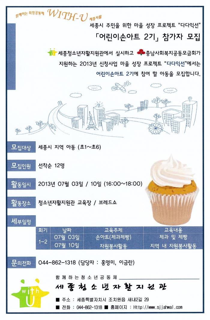 「어린이손아트 2기」 참가자 모집 페이지 정보 작성자 관리자 댓글 0건 조회 8,485회 작성일 13-07-01 02:54 목록 본문 「어린이손아트 2기」 참가자 모집 이전글하계 청소년수련활동 “동고동락(同苦同樂)” 참가자 모집 13.07.09 다음글「청소년드림스케치」 청소년 모집 13.06.25 댓글 0 댓글목록 등록된 댓글이 없습니다.