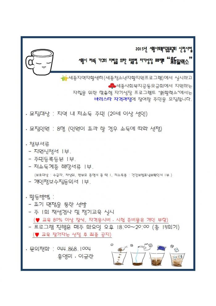 세종시 저소득 가구의 자립을 위한 맞춤형 자기성장 프로젝트 “新활력소” 참가자 모집 페이지 정보 작성자 관리자 댓글 0건 조회 10,896회 작성일 15-06-10 01:55 목록 본문 이전글[알림] 청소년어울림마당 "ECO 마당" 연기 안내 15.06.15 다음글전문 자원봉사자를 모집합니다. 15.06.09 댓글 0 댓글목록 등록된 댓글이 없습니다.