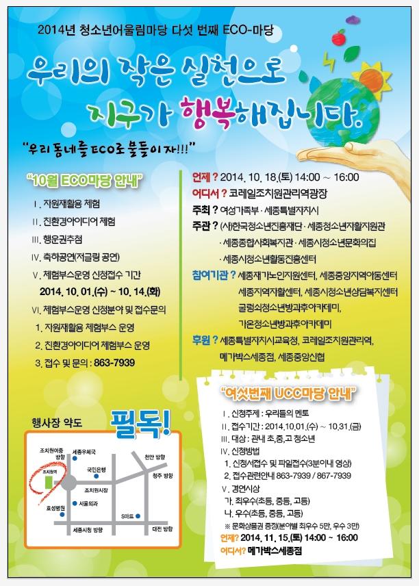 2014년 세종특별자치시 청소년어울림마당 ‘ECO 마당’ 페이지 정보 작성자 관리자 댓글 0건 조회 11,093회 작성일 14-10-06 04:38 목록 본문 이전글세종형 사회적기업가 양성 과정 교육 진행 15.01.21 다음글원도심 아트프리마텟 좋지~One(원)! 14.09.22 댓글 0 댓글목록 등록된 댓글이 없습니다.