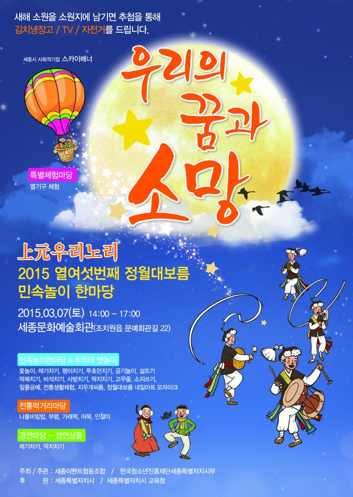 2015년 정월대보름 민속놀이 한마당 페이지 정보 작성자 관리자 댓글 0건 조회 10,772회 작성일 15-02-27 11:24 목록 본문 이전글세종지역자활센터 2014년 후원금품 수입 및 사용결과 공고 17.02.28 다음글2015 청소년어울림마당 "기획단 청소년 모집" 15.02.02 댓글 0 댓글목록 등록된 댓글이 없습니다.