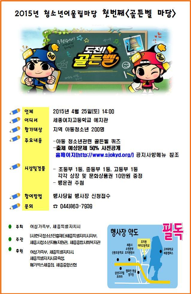 2015년 청소년어울림마당 첫번째 <골든벨 마당> 페이지 정보 작성자 관리자 댓글 0건 조회 11,284회 작성일 15-04-15 09:32 목록 본문 이전글전문직업인은 모집합니다. 15.06.01 다음글 2014년 세종지역자활센터 세입·세출결산서 공고 17.02.28 댓글 0 댓글목록 등록된 댓글이 없습니다.