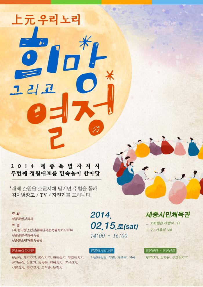 2014 정월대보름민속놀이한마당 페이지 정보 작성자 관리자 댓글 0건 조회 11,575회 작성일 14-02-03 03:47 목록 본문 이전글2014 청소년어울림마당 기획단 모집 14.02.19 다음글2014 가온 청소년방과후아카데미 참가 청소년 모집 14.01.20 댓글 0 댓글목록 등록된 댓글이 없습니다.
