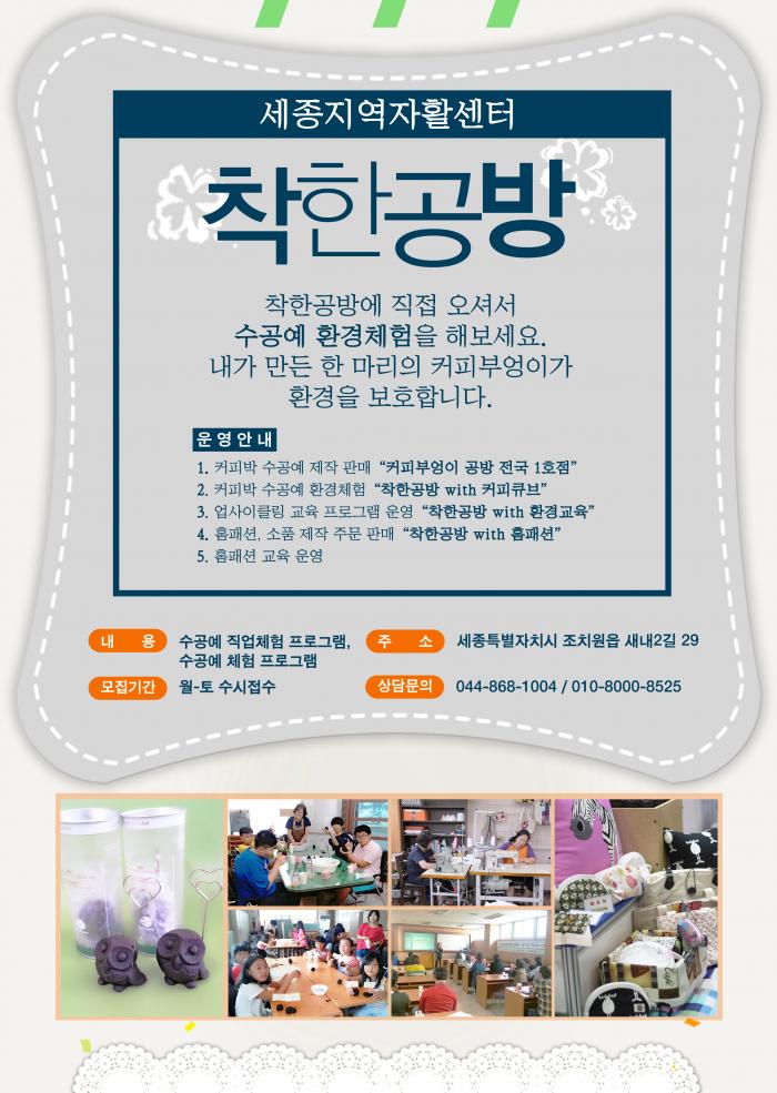 세종지역자활센터 「착한공방」 페이지 정보 작성자 관리자 댓글 0건 조회 11,692회 작성일 19-08-21 10:38 목록 본문 이전글세종지역자활센터 「브레드쇼」 19.08.21 다음글2014 청소년어울림마당 기획단 모집 14.02.19 댓글 0 댓글목록 등록된 댓글이 없습니다.